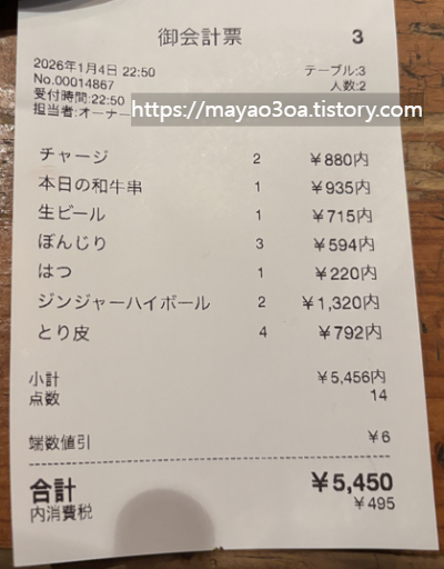 자릿세(오토시): 일본 야키토리 집 특성상 1인당 440엔(세금 포함)의 자릿세가 있습니다.