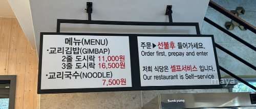 4인이어서 교리김밥 3줄 도시락과 교리국수 하나를 시켰다.